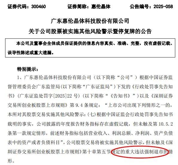 。该公司2021年、2022年财务数据不实。经查,汇伦水晶、赵继庆主要在两个方面涉嫌违反信息披露法律法规:一是汇伦水晶未按规定披露资本覆盖率事项。据介绍,2020年,汇伦水晶以采购设备材料、工程预付款等名义向东莞某科技有限公司、东莞某拆迁有限公司等7家公司支付款项,后转至控股股东新疆汇伦股权投资合伙企业(有限合伙)(简称合伙企业)(以下简称“汇伦”)及公司实际控制人赵继庆本人等关联人银行账户,目的是为了再融资。新疆汇伦的股权质押和赵吉庆的个人贷款。 2020年累计实现金额2833万元,期末余额2663万元。覆盖资金金额占汇伦水晶2020年年报披露净资产的5.12%。 2025年3月,关联方已归还上述基础资金及利息。其次,汇伦水晶在2021年和2022年增加了费用和收入。2021年至2022年,为了覆盖前述资本覆盖率,汇伦水晶在向供应商付款后,在公司账面上积累了原材料、固定资产和其他资产。上述财产以原材料成本和摊销成本的形式增加了2021年成本和公司成本8, 639,070.52元,错误地减少了2021年总收入8,639,070.52元;虚增2022年成本费用23,954,692.38元,虚减2022年总收入23,95元4692.38元。 2021年至2022年,汇伦水晶首先通过与深圳某电子有限公司等7家客户签订虚假订单、虚构业务文件、虚假发货等方式虚增营业收入。其次,在与某特定公司、特定(香港)公司等3家客户的交易中,对并非客户实际拿走的产品确认收入。三、与客户深圳电子有限公司的销售业务中,多确认的收入未予抵销。上述情况导致汇伦水晶2021年度将增加营业收入25,489,938.60元,增加营业费用8,405,160.43元,增加总收入17,084,778.17元; 2022年营业收入增加62,333,644.39元,营业费用增加。资本金41,019,509.51元,虚增利润总额21,314,134.88元。上级结转营业费用中超额1,231,618.19元这是由于资本覆盖而预付的材料采购成本。对此,证监会给予汇伦水晶300万元罚款,对赵继清给予警告并罚款400万元,其中,作为直接负责的主管人员被罚款200万元,作为实际控制人被罚款200万元。时任副总经理韩巧云、董事、财务总监邓友强、总经理姜建伟、总经理韩吉岭也受到处分。汇伦水晶在另一则公告中表示,上述违规行为并未引发《深圳证券交易所创业板股票上市规则》第十章第五节规定的主要违规行为被强制下架的情况。同时实施其他风险警示,股票简称由“汇伦水晶”变更为“圣汇伦”;股票代码不变,仍为“300460”。